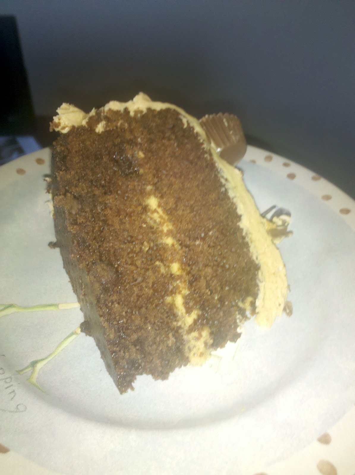 After all is said and done and the cake has been frosted this is the delicious product that you are left with. Try really really hard to not just dive into this cake. Just the smell of the chocolate goodness and the peanut butter was enough to make me crazy!